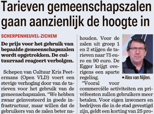 Alex Van Nijlen, voorzitter van de Cultuurraad en N-VA bestuurslid, is verbolgen over de tariefwijziging. We hebben geen enkele kans gehad om dit met de verenigingen door te praten. Voor sommigen brengt deze tariefwijziging hun werking in gevaar.